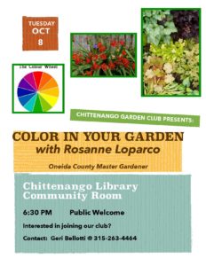 October’s regular meeting will be held at 6:30 p.m. Tuesday, Oct. 8, 2019, in the Sullivan Free Library’s Chittenango location community room. Featured speaker will be Rosanne Loparco, Oneida County master gardener, who will present “Color in your Garden.”