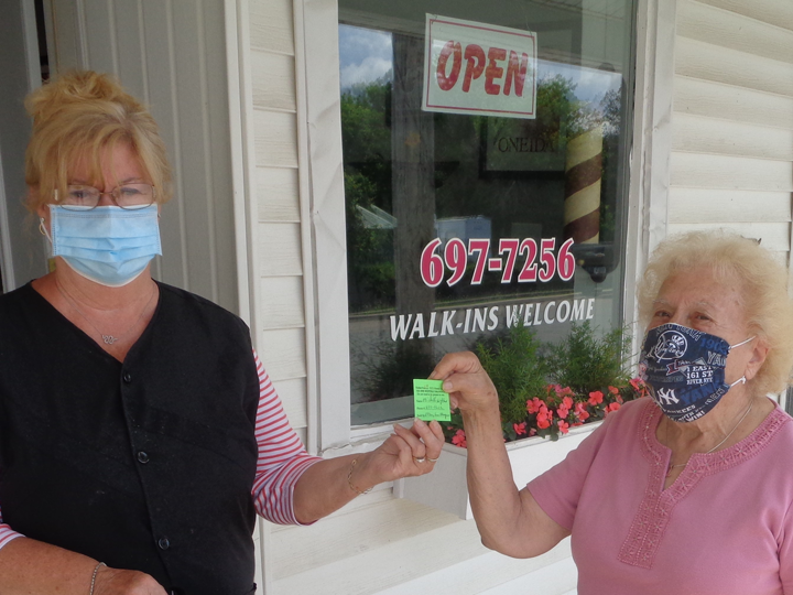 Sherry Parr of Hair Depot at 184 Canal S., Canastota steps out of her recently re-opened beauty shop to draw the fifth winning ticket for Canastota Alumni Association’s $500 drawing. Raffle chairperson Lynne Ahnert announces the winning ticket belongs to Michelle Highland of South Bend, Indiana. One more drawing to take place at end of June. Good luck to all possessing tickets!