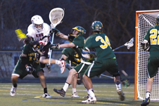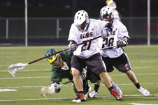 Defender Joe Gilona #27 and Middie Kyle Zimmer #28 steal the ball from a Lancer Attacker. Zimmer led the Bears with three goals.