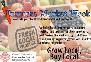 Cornell Cooperative Extension of Jefferson County will celebrate National Farmers Market Week by speaking with local food producers, hearing their success stories and continuing to increase the programming and development of the local food markets.