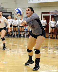 Senior Caitlin Cremin recorded a match-high 22 digs Friday night for the Colgate volleyball team against American University. (Photo by Bob Cornell)
