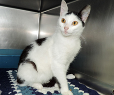 Thelma is an adorable, 7-8 month old, white and black spotted kitty. She is outgoing and curious and she likes other cats. This playful girl can’t wait to meet you.