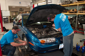 From left, William Yarns, of Staten Island, and Cody Kietzmann, of Amsterdam, check a vehicle’s oil and tires. The Ford ASSET students were among those who volunteered to perform oil changes for the elderly during the college’s April Month of Service. (Photo by Nicolas Murphy, public relations assistant, Morrisville State).