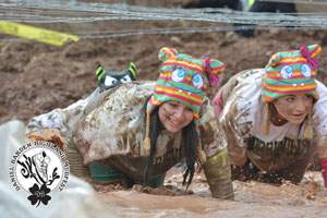 From left, RA Amy Broedel and RA Lauren McDonald crawl under barbed wire during the Daniel Barden Highland Mudfest. Their participation was part of the college’s April Month of Service. (Photo courtesy of the Daniel J. Barden run).