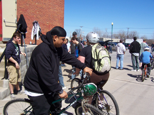 Volunteers from the Morrisville State College AutoTech program, from Community Action Partnership and others were on hand to greet families and match each with a bike to suit their need and intended use. Sarah Smith from Fidelis Care, which provided funding to purchase helmets, was also on hand with handouts and information for guests.
