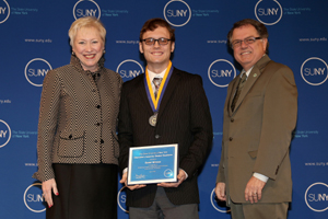 Daniel Mirocco poses with his award with SUNY Chancellor Nancy Zimpher and Morrisville State College President Dr. William J.Murabito.