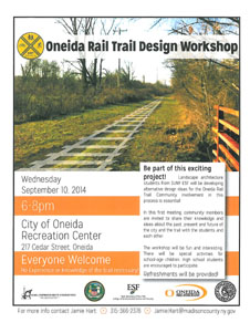 (Oneida, NY – Sept. 2014) Landscape architecture students from SUNY ESF will be developing alternative design ideas for the Oneida Rail Trail. Community involvement in this process is essential.