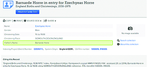 Record of baptism of Hezekiah Hoar (“Ezechyeas Horre”).