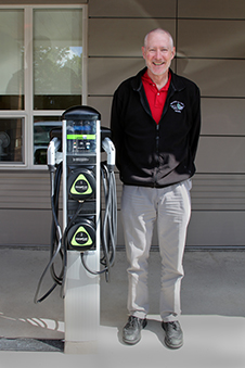 Greg Tyler poses with Morrisville State’s newly installed ChargePoint EV Charging Station