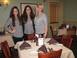 Morrisville State students pose while setting up the dining room. From left: Sara Collier of Madison; Denae Rinaldo of Canastota, both resort and recreation service management students; and Paige Barbera of Long Island, an individual studies major. (Photos by Franci Valenzano)