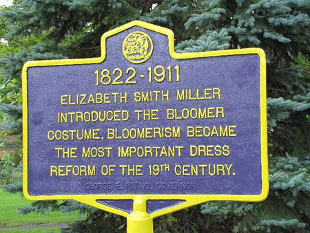 New York State sign dedicated to Elizabeth Smith Miller in 1998 honoring Miller as Madison County’s representation for Governor’s Commission for Women of Achievement. The Stewards for the Gerrit Smith Estate National Historic Landmark in Peterboro hold a tea annually to celebrate Miller’s birth date.