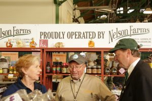 Morrisville State College President Dr. David Rogers (right), Depart-ment of Agriculture and Markets Commissioner Richard A. Ball and State Labor Commissioner Roberta Reardon pause at the Nelson Farms stand (run by the Auxiliary Corporation of Morrisville) during Agriculture Career Day at the Great New York State Fair Friday. Photo Credit: Ben Martin, Digital Media Producer