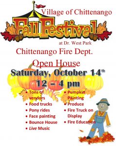 There will be a fall open house and festival at the Chittenango Fire Department on Genesee Street in Chittenango. Organizers have arranged for more than 65 vendors, activities for kids, food, and the firehouse is holding its annual open house with the trucks to be on display.