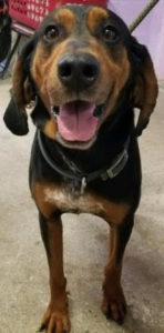 Bear is a 6-year-old male black and tan coonhound. He would love to meet you. He gets along with all kids of all ages, but he’s not sure he understands his size. He is a fast and quick learner and always willing to please. He gets along with other dogs, but he’s not quite sure how to take cats. His loud bark can be too much for you to handle in the kennels, but meet him outside, and he’ll quiet down until he gets excited and sees new people.