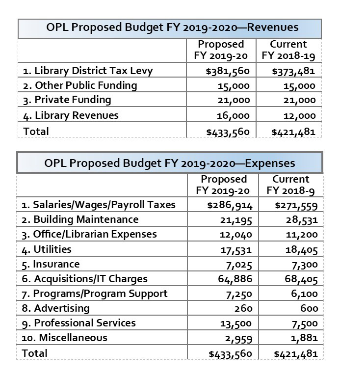 “We have worked hard to keep the operating budget for the upcoming year within the state tax cap while maintaining the high level of services the library provides to the community,” said OPL Director Michele Ryan. “It is always a challenge to provide the same level of exceptional service year to year while stretching funds to meet our basic needs. We pride ourselves on giving great value for your tax dollar.”